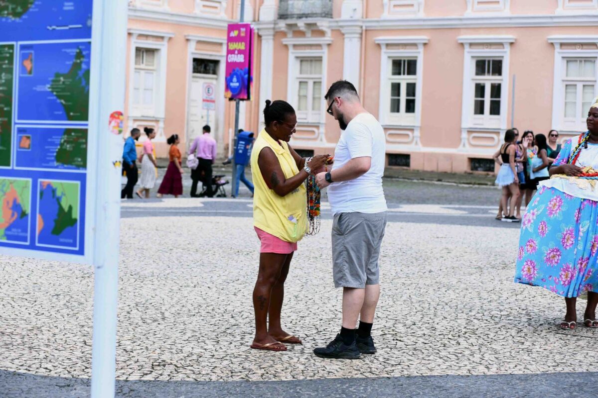 Nascido e criado no Centro Histórico, Alexandro Américo dos Santos, 36 anos, vende colares no Terreiro de Jesus há mais de 20 anos. Desde a instalação do Distrito, passou a trabalhar devidamente identificado com colete ofertado pela Secretaria de Ordem Pública (Semop) e recebeu cursos de atendimento e gestão de negócios oferecidos em parceria com a Secretaria de Desenvolvimento, Emprego e Renda (Semdec).