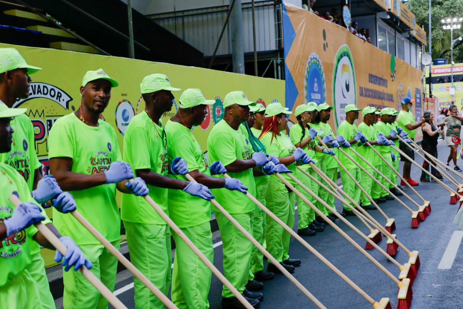 O tradicional “bloco da limpeza”, formado por agentes da Empresa de Limpeza Urbana de Salvador (Limpurb), marcou presença em mais um dia de Carnaval no Campo Grande. Neste domingo (11), os profissionais levaram muita alegria para o circuito Osmar e varreram a pista entre a passagem dos trios com a famosa formação das “Passarelas da Limpeza”, atuando de forma perfilada, entre danças e coreografias animadoras.