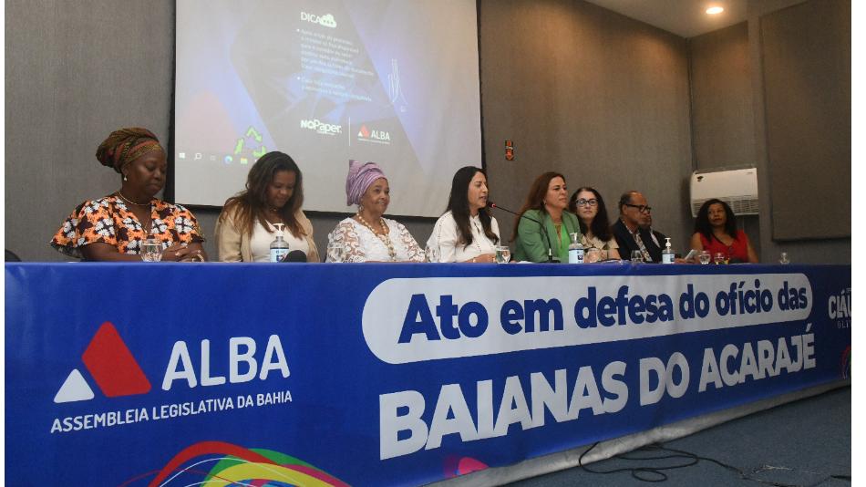 A Assembleia Legislativa da Bahia (ALBA) promoveu, na tarde desta segunda-feira (15), um ato em defesa do ofício das baianas de acarajé. O evento ocorreu no Auditório Jornalista Jorge Calmon e foi proposto pela deputada Cláudia Oliveira (PSD), que conduziu os trabalhos da mesa.