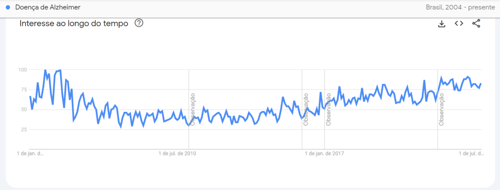 Já no Brasil, os anos de pico das pesquisas sobre Alzheimer correspondem a 2004 e 2005, seguidos por 2022, que registrou pontuação de 89 em março.