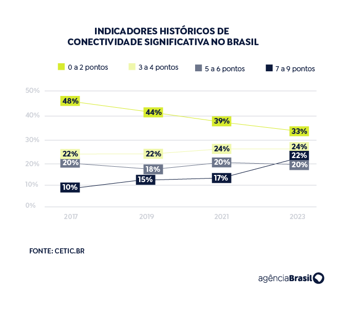 Apenas 22% dos brasileiros com mais de 10 anos de idade têm condições satisfatórias de conectividade, apesar de o acesso à internet estar perto da universalização no país. Outros 33% da população estão no nível mais baixo do índice que mede a conectividade significativa no país (de 0 a 2 pontos) e 24% ocupam a faixa de 3 a 4 pontos.