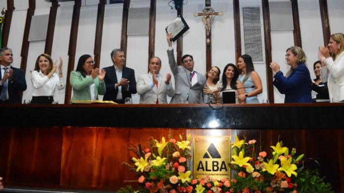O Plenário Orlando Spínola ficou lotado para homenagear o ex-deputado estadual e atual deputado federal Leo Prates (PDT), que recebeu, bastante emocionado, a maior honraria da Assembleia Legislativa da Bahia (ALBA) na manhã desta sexta-feira (12). A sessão especial que outorgou a Comenda 2 de Julho ao congressista foi proposta pelo deputado Vitor Azevedo (PL) e reuniu lideranças, políticos, correligionários, amigos e familiares do homenageado. Os deputados Tiago Correia (PSDB), Marquinho Viana (PV), Luciano Araújo (SD), Samuel Junior (Republicanos) e Fabíola Mansur (PSB) foram destacados para conduzir Prates ao plenário da Casa.