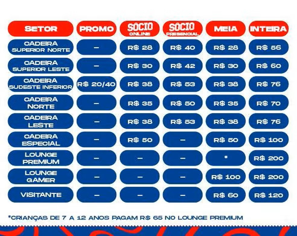 Há gratuidade para crianças de até 11 anos. A exceção fica por conta dos camarotes e do Lounge Premium, que têm idade limite de até 6 anos.
