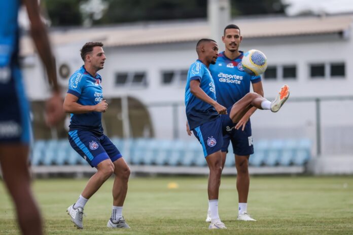 Após um breve aquecimento com o preparador físico Danilo Augusto, os atletas participaram de um treino técnico com ênfase na posse de bola.