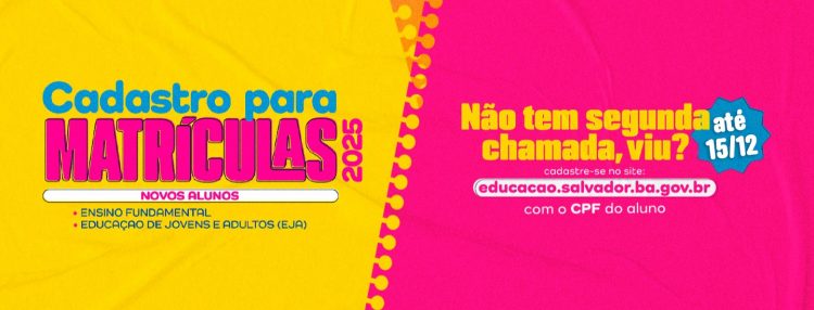 O cadastro é destinado aos estudantes do 1° ao 9° ano do Ensino Fundamental, com idade a partir de 06 (seis) anos (desde que completados até 31/03/2025), para ingresso em escolas da Rede Municipal de Ensino de Salvador.
