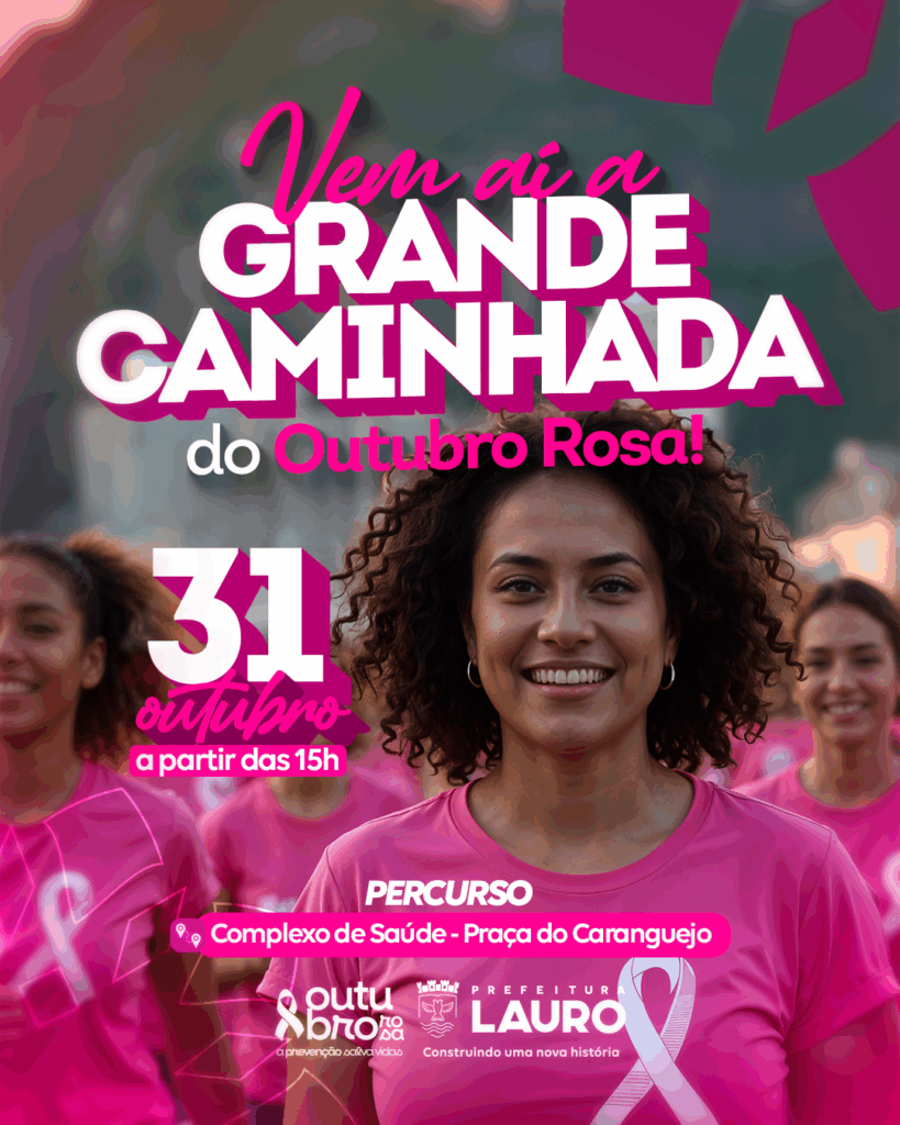 A Prefeitura de Lauro de Freitas realiza, nesta sexta-feira (31), a Caminhada Outubro Rosa 2025, em alusão à campanha de prevenção e combate ao câncer de mama. A concentração será no Complexo de Saúde, com destino final à Praça do Caranguejo, em Itinga, a partir das 15h.