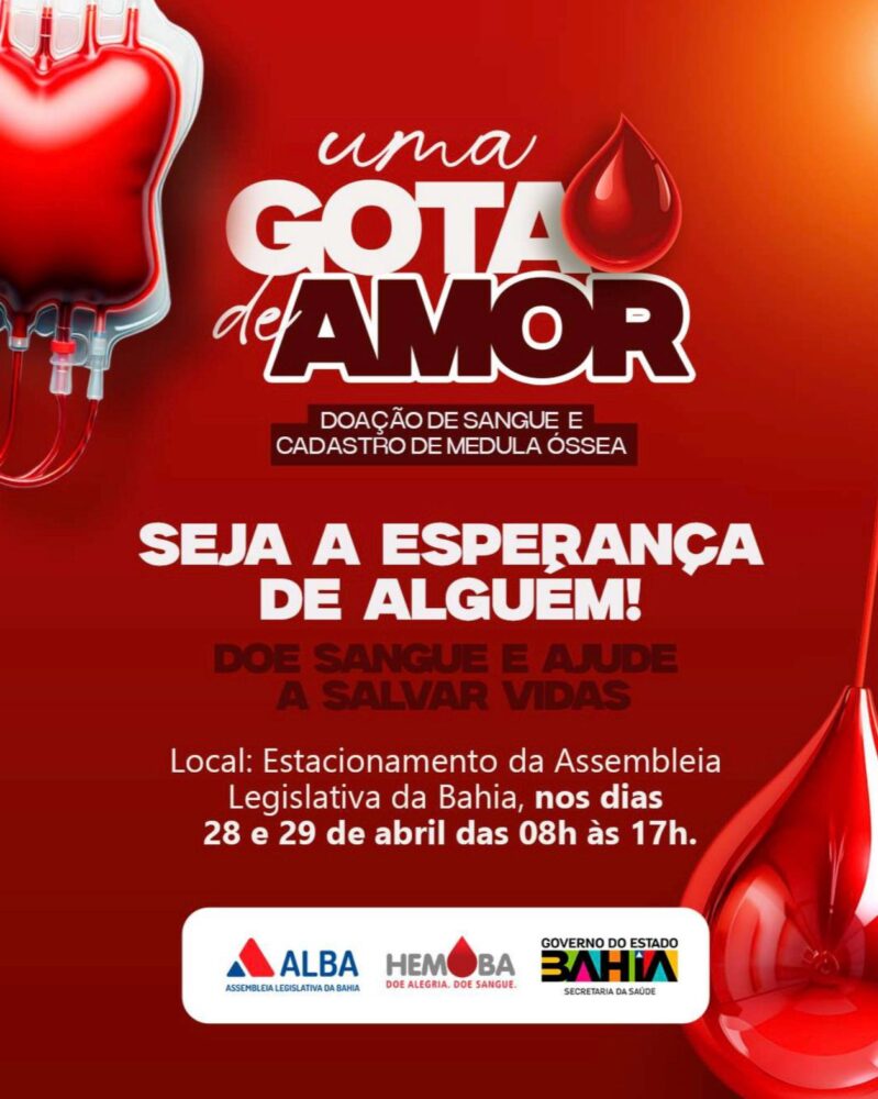 Nos dias 28 e 29 de abril, das 8h às 17h, a Assembleia Legislativa da Bahia (ALBA) será transformada em um grande centro de solidariedade. A campanha “Uma Gota de Amor”, promovida pela ALBA em parceria com o Governo do Estado, tem como objetivo mobilizar a população para a doação de sangue e o cadastro de medula óssea, reforçando os estoques dos hemocentros e ampliando a esperança de vida para milhares de pacientes.