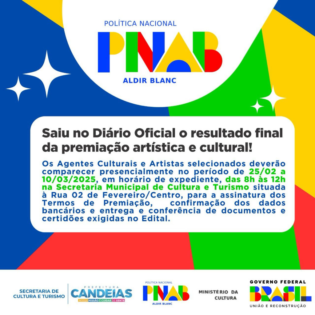 A Prefeitura de Candeias divulgou a relação dos agentes culturais e artistas que foram premiados pelo edital da Política Nacional Aldir Blanc de Fomento à Cultura (PNAB). O resultado pode ser consultado no diário oficial, edição n.º 6062.