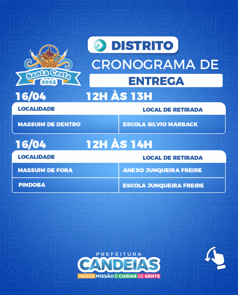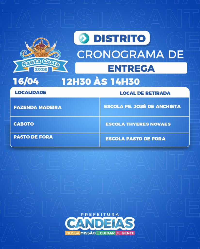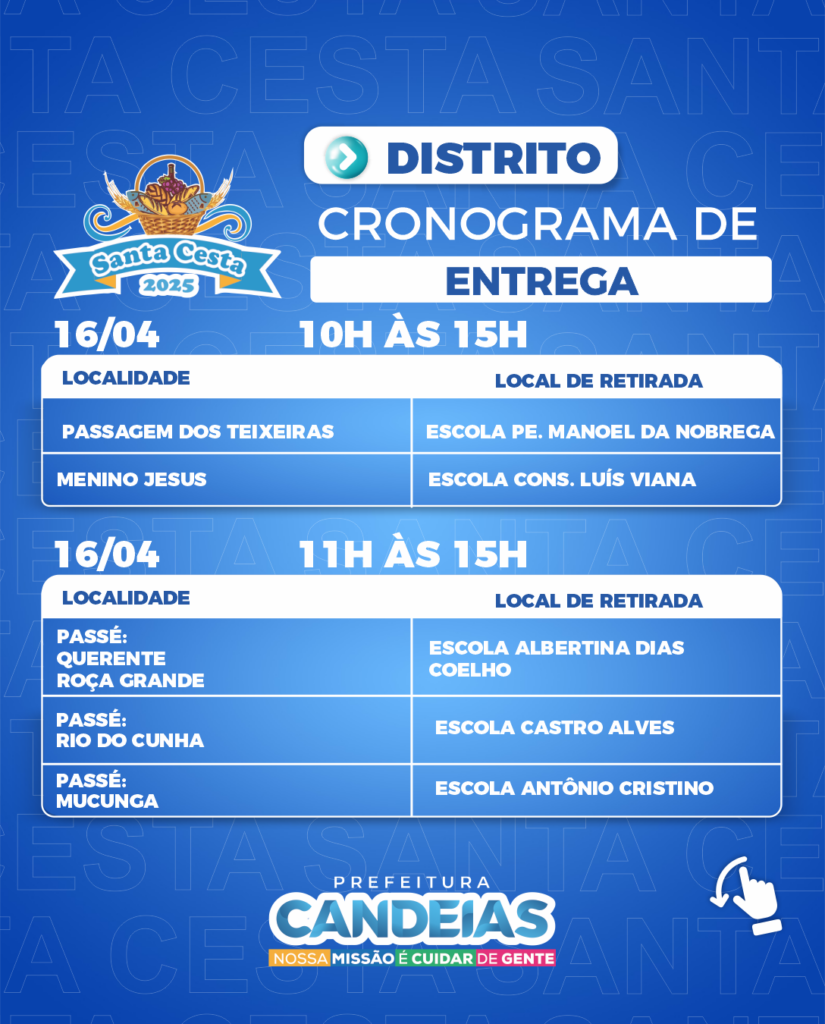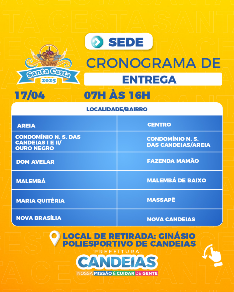 A partir das 9h desta quarta-feira (16), a Prefeitura de Candeias, por meio da Secretaria de Promoção Social e Combate à Pobreza (SEMPS), começa a entregar as cestas e peixes para mais de 20 mil famílias tanto da sede quanto dos distritos da cidade.