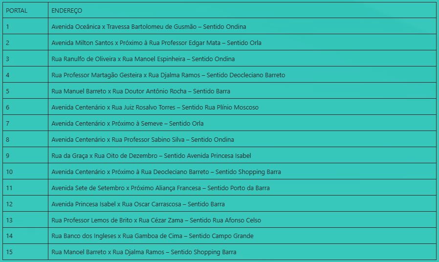 “Por mais um ano utilizamos uma tecnologia que tem se mostrado exitosa no ordenamento do trânsito. Esses portais estão localizados em locais estratégicos para que possamos garantir o acesso de moradores e foliões nas áreas do entorno da festa”, explica o superintendente da Transalvador, Decio Martins.