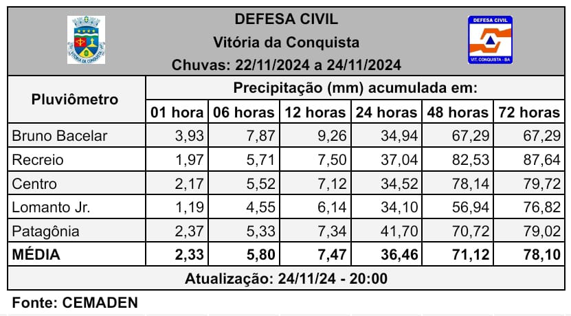 As chuvas continuam sem trégua em Vitória da Conquista. Em dois dias e meio já choveu quase 80mm, segundo a última atualização feita pela Defesa Civil Municipal, às 20h deste domingo (24). O Comitê de Crise, orientado pela prefeita Sheila Lemos, mantém o monitoramento na cidade e na Zona Rural, além do atendimento à população. Até o momento, 12 famílias precisaram de assistência da Prefeitura. Graças às ações preventivas e às obras de infraestrutura realizadas nos últimos anos, para sanar problemas antigos em loteamentos como Panorama, Bateias II, Comveima I, Vila Marina e Miro Cairo, os impactos das chuvas foram reduzidos de forma significativa em todo o município.