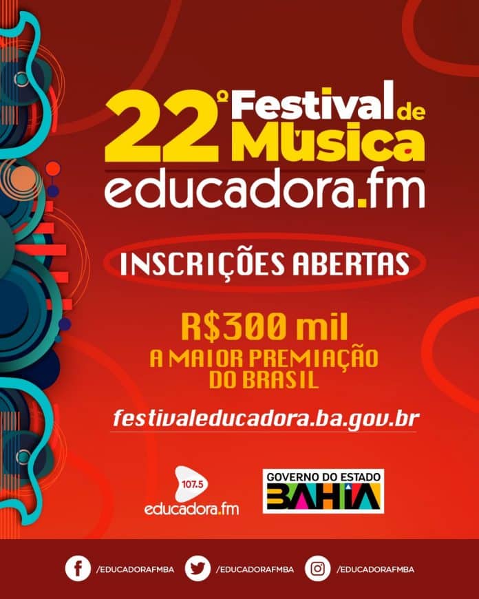 A rádio pública da Bahia anuncia o 22° Festival de Música Educadora FM com a maior premiação do Brasil, distribuindo R$ 300 mil para 50 artistas com prêmios de R$ 5 mil a R$ 18 mil. As inscrições já estão abertas a partir desta quarta-feira (12) e vão até às 18 horas do dia 12 de julho de 2024, exclusivamente através do site festivaleducadora.ba.gov.br.