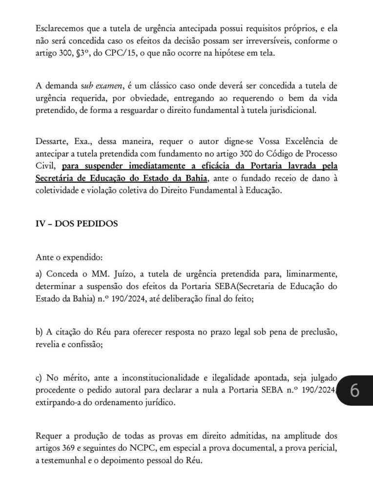 “O desempenho da Bahia só é melhor que o do Amapá, Pará e Rio Grande do Norte. Em comparação com 2019, o estado melhorou apenas três décimos”, completou. Na ação, o deputado solicita a suspensão imediata dos efeitos da portaria, “devido ao temor justificado de prejuízo à comunidade e à violação coletiva do Direito Fundamental à Educação”.