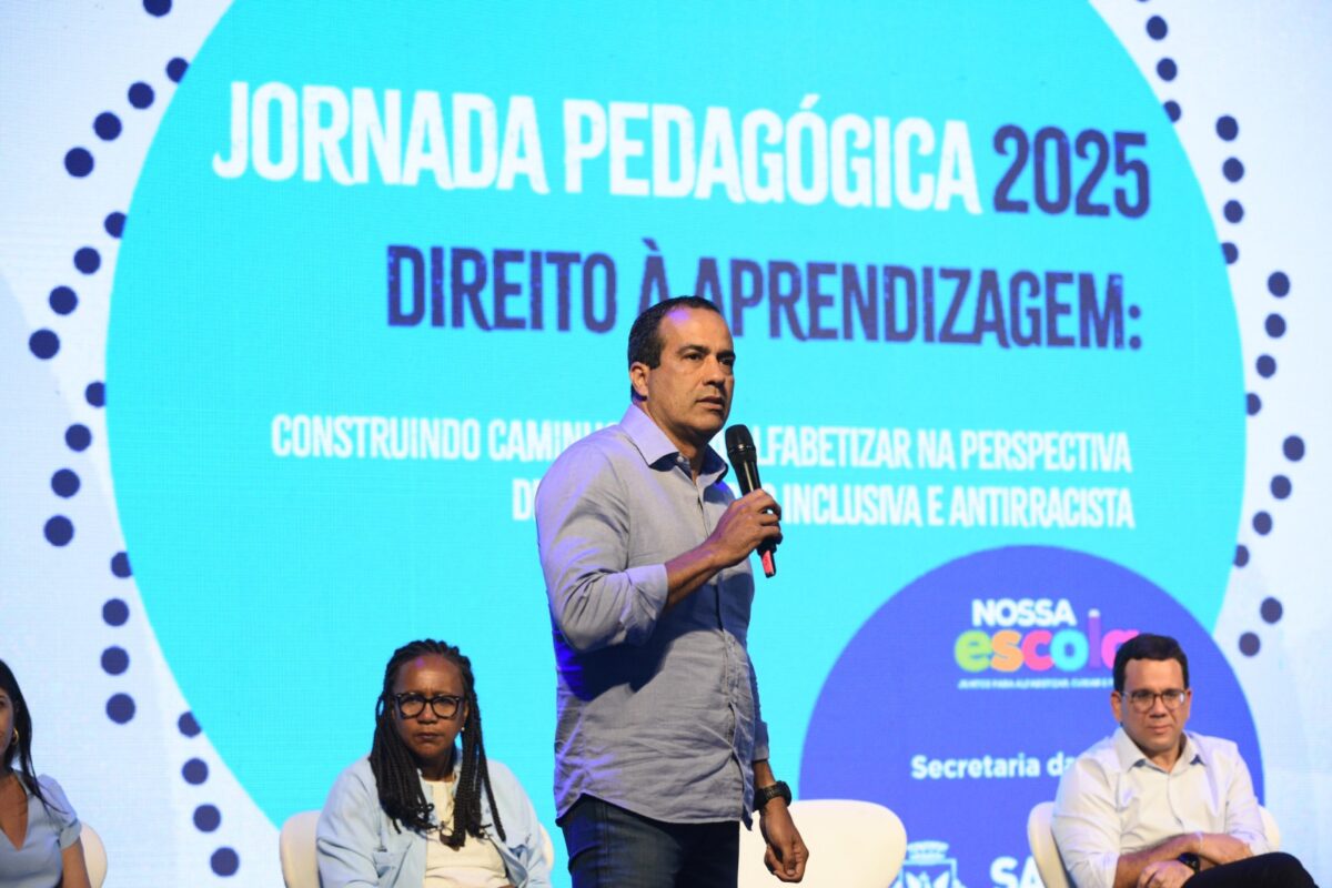 A Jornada Pedagógica da Rede Municipal de Salvador reuniu professores, coordenadores e outros profissionais da educação, na tarde desta terça-feira (4), para planejar, capacitar e alinhar práticas pedagógicas para o ano letivo que se inicia. O evento foi iniciado nesta segunda-feira (3) e teve o encerramento realizado nesta terça no Cerimonial Rainha Leonor, na Pupileira, em Nazaré, com a presença do prefeito Bruno Reis e do titular da Secretaria Municipal da Educação (Smed), Thiago Dantas.