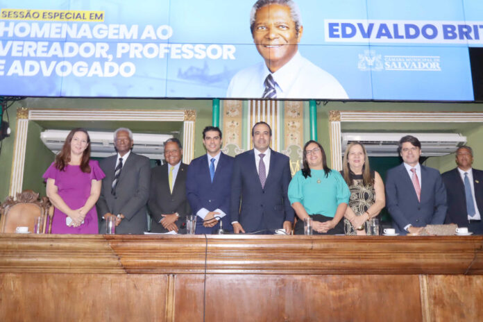 Uma sessão especial realizada na noite de segunda-feira (02) marcou a despedida do vereador e jurista Edvaldo Brito (PSD) da Câmara Municipal. A homenagem, proposta pelo colega Alexandre Aleluia (PL), celebrou o encerramento da trajetória de Brito na Casa, após três mandatos consecutivos, decisão do próprio vereador, que optou por não buscar a reeleição.