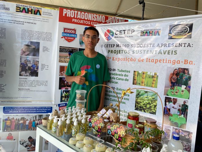 Um dos projetos em destaque no stand do Núcleo Territorial do Médio Sudoeste da Bahia (NTE 8) é o “Confecção de tubetes biodegradáveis a partir do resíduo da cana-de-açúcar”. O estudante João Gabriel Fraga, 17, do curso técnico em Zootecnia, do Centro Territorial de Educação Profissional (Cetep) do Médio Sudoeste da Bahia, explicou que o objetivo do trabalho é substituir os tubetes de plástico, que auxiliam o plantio de mudas, para os biodegradáveis, feitos com esterco bovino, casca de ovo e resíduo de cana-de açúcar: “nós misturamos os ingredientes com uma cola caseira, produzida com vinagre, água e maisena, e moldamos os tubetes para serem plantados diretamente na terra”.