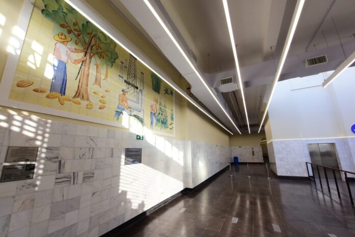 A Fundação Gregório de Mattos (FGM) promoveu o restauro do painel azulejar figurativo intitulado “Riquezas da Bahia: petróleo, cana-de-açúcar, cacau, sisal e fumo”, localizado no Elevador Lacerda. A obra foi entregue na terça-feira (25) após um processo de requalificação.