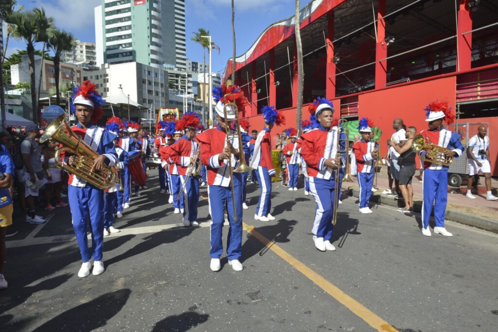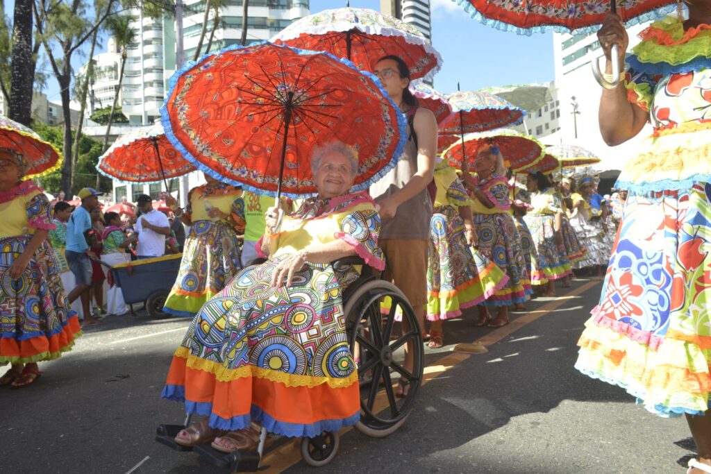 Senhoras girando sombrinhas coloridas desfilaram simpatia, mostrando a força do público da terceira idade. “É a primeira vez que saímos e para nós é uma sensação muito boa estar abrindo o Fuzuê 2025 e mostrando que a pessoa na terceira idade está de forma ativa e participativa no Carnaval de Salvador. Hoje estamos com 50 pessoas, muitas mulheres, algumas usando cadeira de rodas, pois é um dia de muita alegria para todos os públicos. Tocamos músicas em homenagem aos 40 anos do axé music e também aos bailes de fantasia dos antigos Carnavais”, conta o vice-presidente do grupo, Jairo Gomes.
