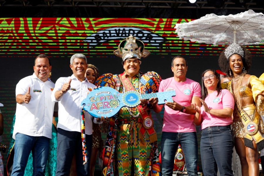 As chaves de Salvador já são do Rei Momo. A entrega simbólica, que marcou a abertura oficial do Carnaval de Salvador 2024, foi realizada na Praça Castro Alves, na tarde desta quinta-feira (8), quando o governador Jerônimo Rodrigues e o vice-governador e coordenador-geral da festa, Geraldo Júnior, ao lado do prefeito e da vice-prefeita de Salvador, entregaram as chaves de Salvador ao Rei Momo. Este ano, com o tema “Nossa energia é ancestral”, o Carnaval de Salvador homenageia os 50 anos da presença dos blocos afro nos circuitos, celebrando a rica cultura e tradição do povo baiano.