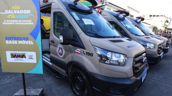 Sessenta e quatro viaturas e uma nova unidade foram entregues para a Polícia Militar da Bahia, na manhã desta quinta-feira (27), no bairro do IAPI, durante o evento ‘São Salvador 476 anos’, que celebra o aniversário da capital baiana. Os novos equipamentos representam investimento de R$ 4 milhões do Governo do Estado. Estrutura e veículos foram entregues pelo governador Jerônimo Rodrigues, acompanhado pelo vice-governador Geraldo Júnior, pelo secretário da Segurança Pública, Marcelo Werner, e pelo comandante-geral da PM, coronel Antônio Carlos Silva Magalhães.