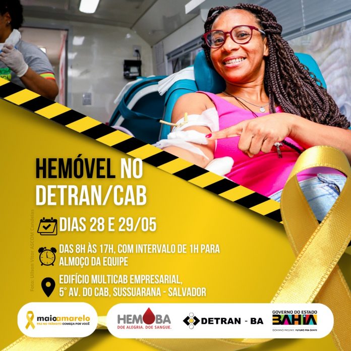 A Hemoba e o Departamento Estadual de Trânsito (Detran-BA) promovem uma campanha de doação de sangue, nestas terça e quarta-feira (28 e 29), em alusão ao Maio Amarelo, um movimento criado com a finalidade de chamar a atenção da sociedade para o alto índice de mortos e feridos no trânsito de todo o mundo. A unidade de coleta móvel da Fundação estará no estacionamento da sede do departamento, das 8h às 17h, com intervalo para almoço, no Edifício MultiCab, no Centro Administrativo da Bahia, em Salvador. Serão atendidos os servidores públicos e a população em geral da região do CAB.