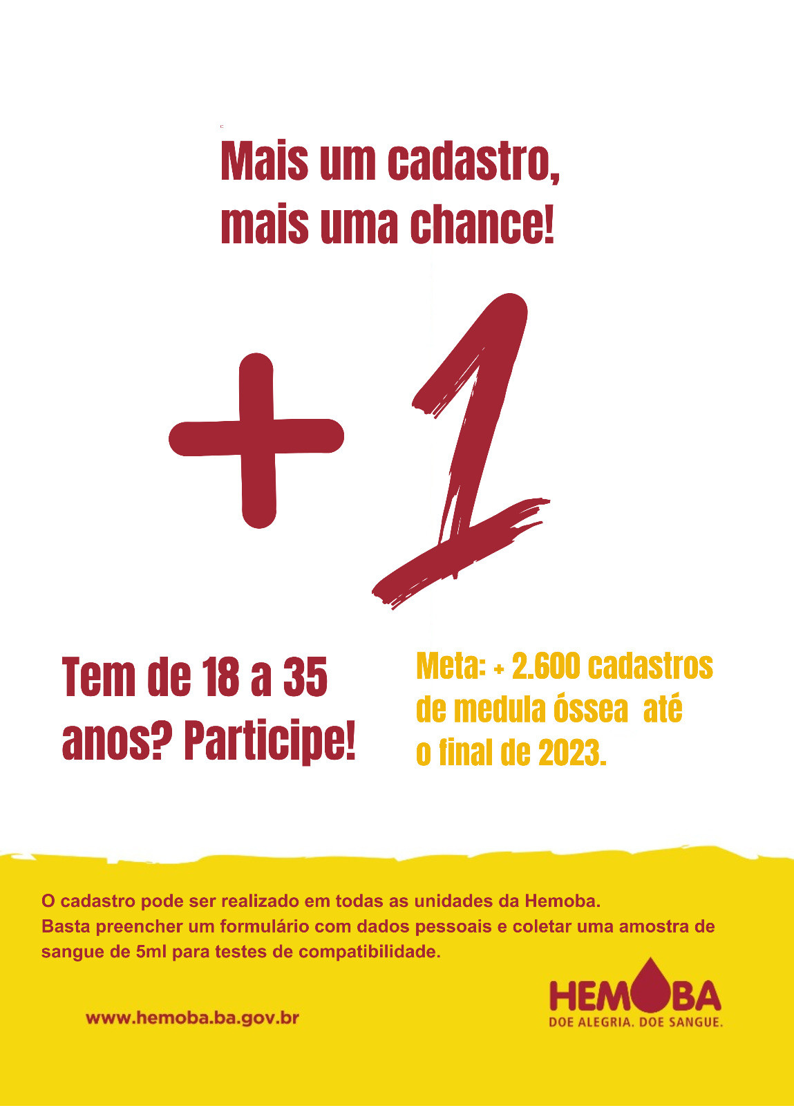 A Hemoba promove a Campanha “Mais um cadastro, mais uma chance” até o final do ano para atingir a meta de 9.244 mil cadastros de doadores de medula óssea por ano para a Bahia, estabelecida pelo Ministério da Saúde. Para alcançar o alvo, faltam ainda cerca de 2600 inscritos, que podem procurar as unidades da Fundação na capital e no interior, onde o voluntário preencherá um formulário com dados pessoais e realizará a coleta de uma amostra de sangue com 5 ml para testes de compatibilidade. Os dados pessoais e os resultados dos testes serão armazenados no Registro Nacional de Doadores de Medula Óssea (REDOME). “A campanha é uma oportunidade para o paciente que está em busca de um potencial doador de medula óssea encontre o seu doador compatível. As 21 unidades do interior e as sete unidades de coleta em Salvador estão preparadas para acolher as pessoas ou grupos de ONGs, empresas, igrejas, movimentos sociais etc. que tenham interesse em fazer o cadastro. Qualquer dúvida ou informação sobre o tema, acesse as redes sociais e os sites da Fundação Hemoba, INCA (Instituto Nacional do Câncer) e do próprio Redome (Registro de Doadores de Medula Óssea). A nossa meta é atingirmos 2.600 cadastros até o dia 20 de dezembro ou, no máximo, até o dia 30”, convida Iara Matos, Coordenadora da Hemorrede da Hemoba.