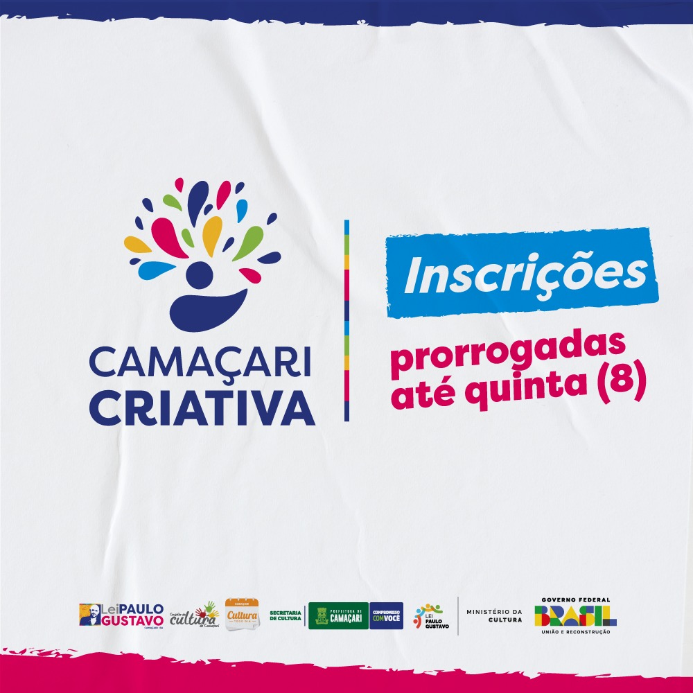 As inscrições para o edital de concurso cultural Camaçari Criativa, que encerrariam nesta segunda-feira (5/2), foram prorrogadas para às 12h da próxima quinta (8), devendo ser feitas por meio do Mapa Cultural de Camaçari, neste link. A iniciativa selecionará projetos nos diversos segmentos, com exceção do audiovisual, para receberem apoio financeiro, com o objetivo de incentivar as diversas formas de manifestação artísticas do município, tendo investimento total de R$ 649.585,76.