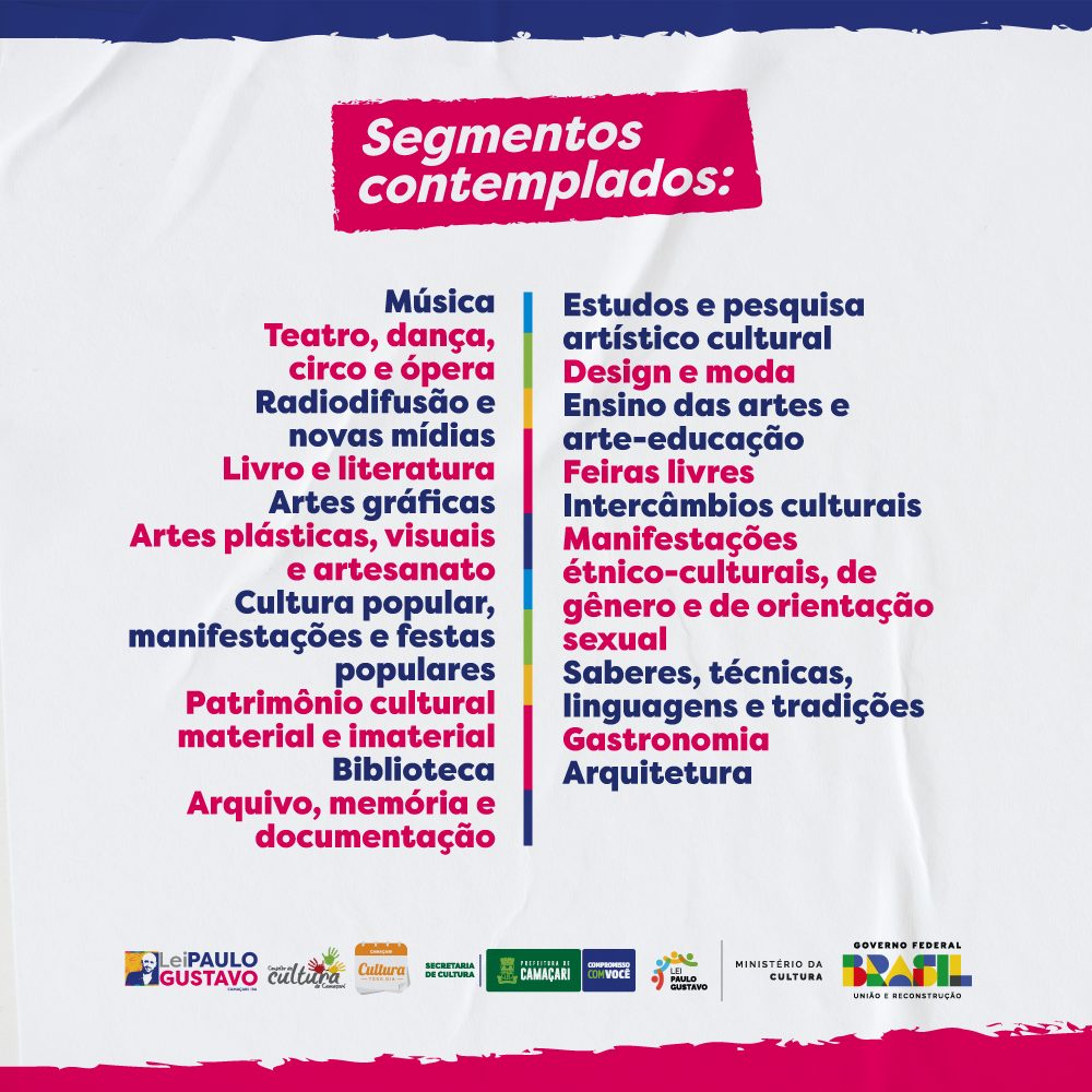Promovido pela Prefeitura de Camaçari, através da Secretaria da Cultura (Secult), o certame é o terceiro de quatro editais realizados no município com aplicação dos recursos da Lei Paulo Gustavo (LPG). Serão contempladas as linguagens de música; teatro, dança, circo e ópera; radiodifusão e novas mídias; livro e literatura; artes gráficas; artes plásticas, visuais e artesanato; cultura popular, manifestações e festas populares; patrimônio cultural material e imaterial; biblioteca; arquivo, memória e documentação; estudos e pesquisa artístico cultural ; design e moda; ensino das artes e arte-educação; feiras livres; intercâmbios culturais; manifestações étnico-culturais, de gênero e de orientação sexual; saberes, técnicas, linguagens e tradições; gastronomia; e arquitetura.