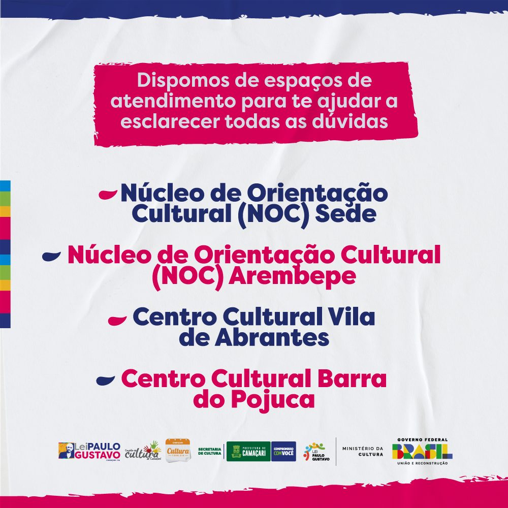 Para auxílio aos interessados, a Secult disponibiliza atendimento presencial nos núcleos de Orientação Cultural (NOC) Cidade do Saber, localizada na Rua do Telégrafo, s/nº., bairro do Natal; e Arembepe, situado na galeria Arembepe Centro Empresarial, sala 1, térreo, no Loteamento Vilarejo, que encontra-se à direita da entrada principal da localidade, em frente ao Posto de Informações Turísticas Nidinho; além dos centros culturais Vila de Abrantes, que fica na Rua da Matriz, s/nº.; e Barra do Pojuca, na Rua Filogonio Gomes de Oliveira, s/nº. Os equipamentos funcionam de segunda a sexta-feira, das 9h às 17h.