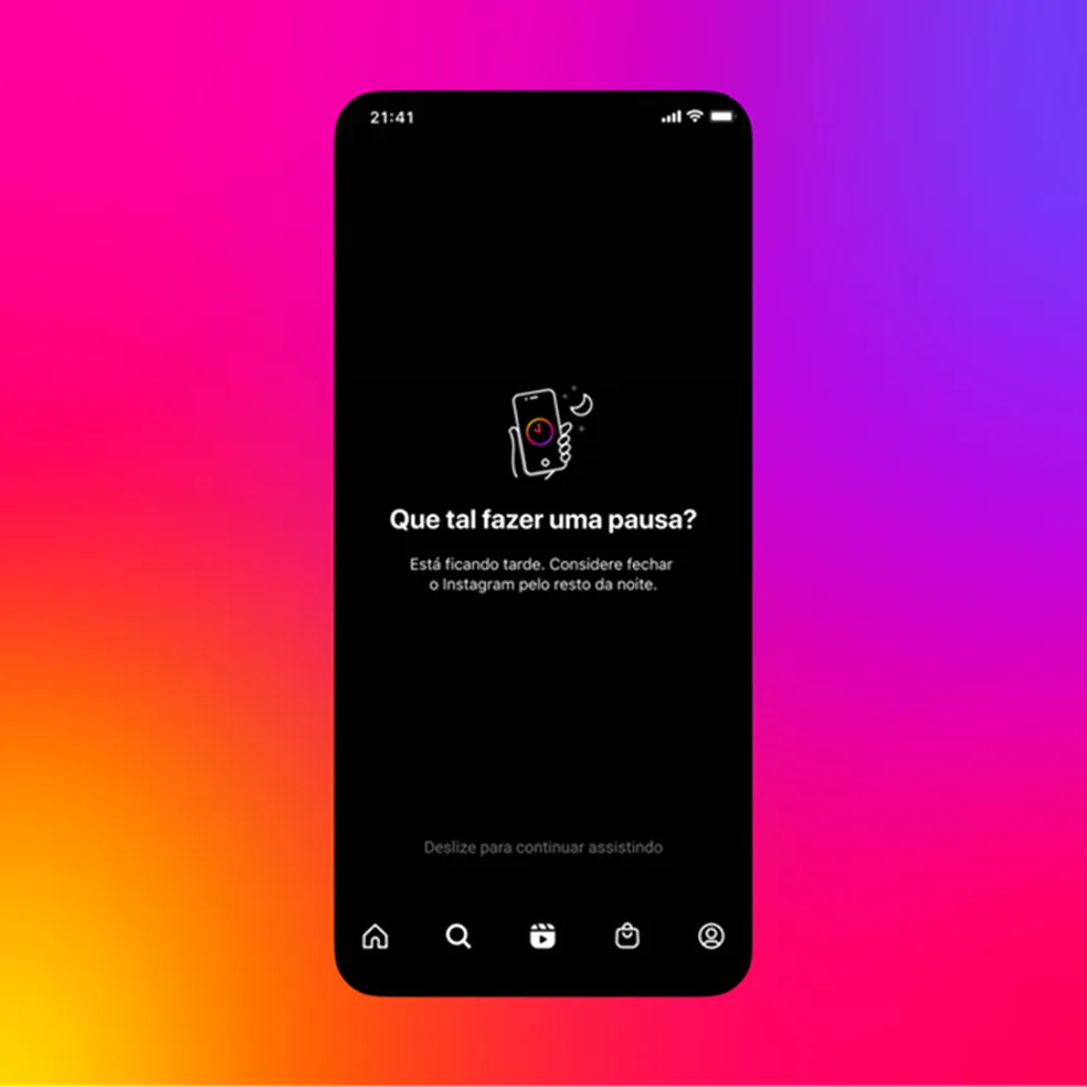 “Que tal fazer uma pausa? Está ficando tarde. Considere fechar o Instagram pelo resto da noite”, diz o alerta que, na prática, funciona apenas como sugestão. Se preferir, o jovem pode continuar usando a rede social.