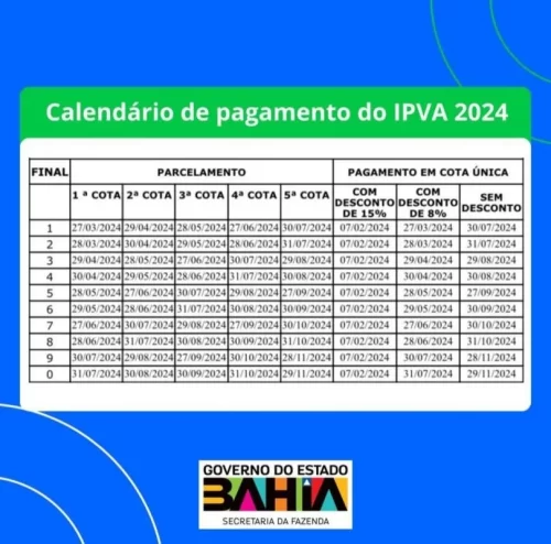 Para isso, é necessário que faça o pagamento do valor integral do tributo até o dia do vencimento da primeira cota do parcelamento previsto para o seu veículo, de acordo com o calendário do IPVA 2024. O Estado da Bahia manteve também a possibilidade de parcelamento em cinco vezes, que pode ser feito conforme o calendário anual, levando em conta o número final da placa do veículo. Caso a opção seja por parcelar o IPVA, o contribuinte deve se lembrar de que os débitos referentes à taxa de licenciamento e a eventuais multas de trânsito deverão ser pagos até o prazo final do pagamento em cota única ou da quinta parcela do IPVA.