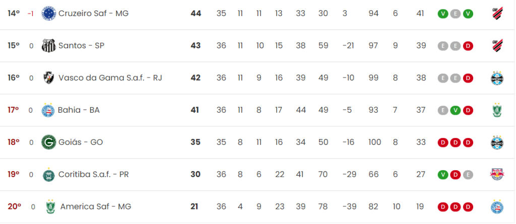 Caso o Santos vença o Athletico Paranaense na Ligga Arena, o time litorâneo paulista avançará para 46 pontos. Enquanto isso, o Vasco pode chegar a 45 pontos se vencer o Grêmio em Porto Alegre. Ao Cruzeiro, bastaria um ponto nos jogos contra Athletico no Mineirão ou Botafogo no Nilton Santos para alcançar os 45 pontos. Se o Bahia perder hipoteticamente para o América-MG, mantendo-se com 41 pontos, não teria como superar seus rivais na última rodada.