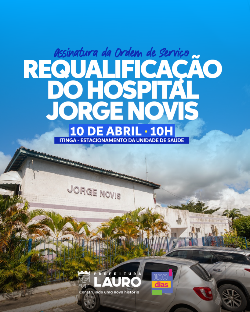 Em mais um passo importante para fortalecer a infraestrutura da saúde no município e a qualidade dos serviços oferecidos à população, a prefeita Débora Régis assina nesta quinta-feira (10/4) a ordem de serviço para a requalificação do Hospital Jorge Novis. A cerimônia acontecerá às 10h, no estacionamento da unidade hospitalar, localizado na Avenida Fortaleza, em Itinga.