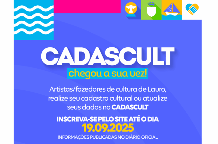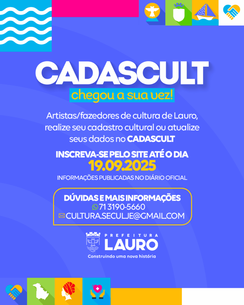 A Prefeitura de Lauro de Freitas, por meio da Secretaria Municipal de Cultura, Lazer, Juventude e Esporte (SECULJE), segue com o Cadastro Municipal de Cultura (CADASCULT), com inscrições, exclusivamente online, até as 18h, do dia 19 de setembro. Essa ação visa ampliar e atualizar o mapeamento cultural, além de compor um banco de dados local.
