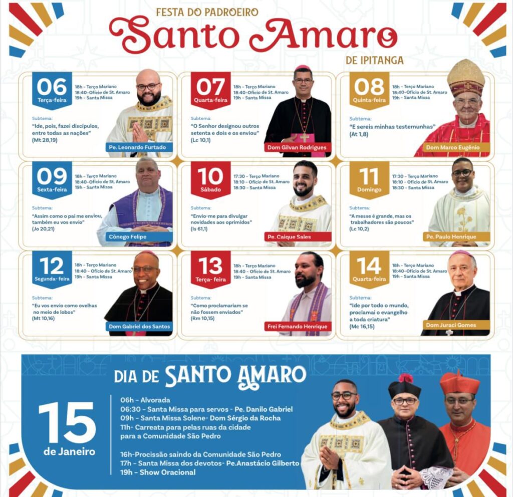 Ao longo dos nove dias de celebração, as santas missas acontecerão sempre às 18h, além de ofícios e outras celebrações em horários específicos. No dia festivo, 15 de janeiro, será realizada a tradicional carreata pelas ruas da cidade, com destino à Comunidade São Pedro, localizada na Rua dos Vereadores, às 11h. Em seguida, acontece a procissão de Santo Amaro de Ipitanga, que sairá da comunidade em direção à Igreja Matriz, às 16h. Encerrando as homenagens ao padroeiro, será celebrada a missa festiva, às 17h, presidida pelo pároco Anastácio Gilberto de Jesus, seguida de um show oracional, marcado para as 19h, na Praça da Matriz.