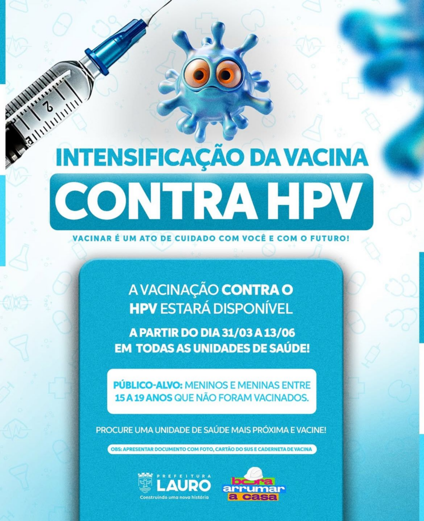 A Prefeitura de Lauro de Freitas, por meio da Secretaria Municipal de Saúde (SESA), inicia na próxima segunda-feira (31/3) uma ação de busca ativa para vacinação contra o HPV (Papilomavírus Humano), voltada aos jovens de 15 a 19 anos que ainda não foram imunizados. Atualmente, pelo Sistema Único de Saúde (SUS), a vacina é destinada a meninos e meninas de 9 a 14 anos, mas, durante esta campanha, a faixa etária está sendo ampliada para alcançar adolescentes e jovens que perderam a oportunidade de se vacinar na idade recomendada.