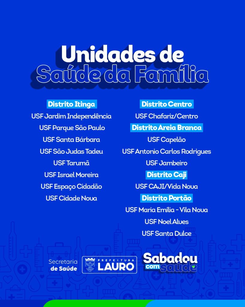 O “Sabadou com Saúde” será realizado mensalmente. Nesta primeira edição, as 16 Unidades de Saúde da Família (USFs) do município estarão abertas oferecendo serviços de vacinação, testagem rápida, saúde bucal, exames preventivos, consultas médicas e de enfermagem, além de ações educativas e práticas integrativas.