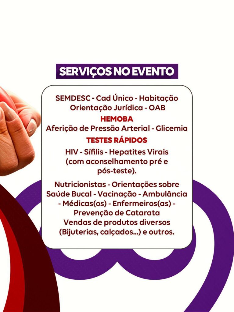 O evento tem como objetivo ampliar o acesso a serviços de saúde, assistência social e cidadania, além de incentivar a doação de sangue, contribuindo para o aumento do estoque. Durante a programação, os moradores poderão realizar doação de sangue, aferição de pressão arterial, avaliação com nutricionista, orientações sobre saúde bucal, controle de glicemia e testes rápidos para Infecções Sexualmente Transmissíveis (ISTs).