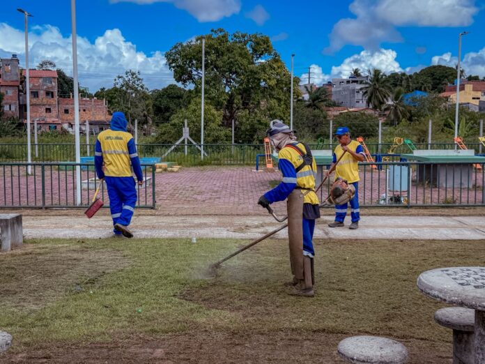 A Prefeitura de Lauro de Freitas, por meio da Secretaria de Infraestrutura e Serviços Públicos, segue com ações de limpeza no município. Desta vez a praça do Parque das Águas, no bairro Quingoma foi contemplado com serviço de roçagem e varrição.
