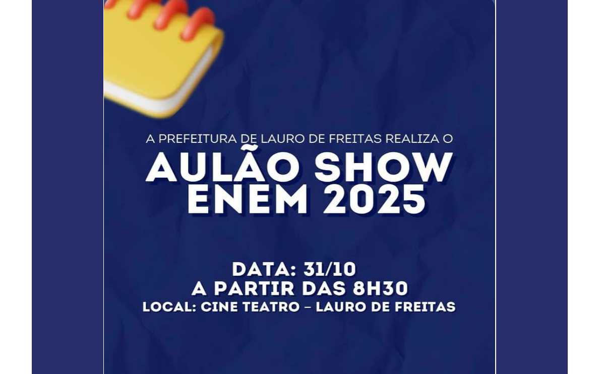 A Prefeitura de Lauro de Freitas, por meio da Secretaria Municipal de Cultura, Lazer, Juventude e Esporte (SECULJE), realiza nesta sexta-feira (31/10), às 8h30, o “Aulão Show ENEM 2025”, no Cineteatro de Lauro de Freitas, localizado na Praça João Thiago dos Santos, no Centro.