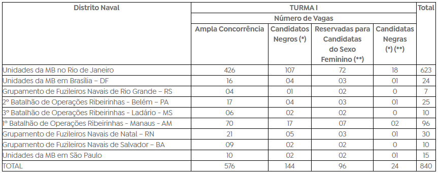 O curso de formação é conduzido simultaneamente pelo Centro de Instrução Almirante Milcíades Portela Alves (CIAMPA), no Rio de Janeiro (RJ) e Centro de Instrução e Adestramento de Brasília Almirante Domingos de Mattos Cortez (CIAB), na capital federal. As vagas estão distribuídas conforme a tabela abaixo: