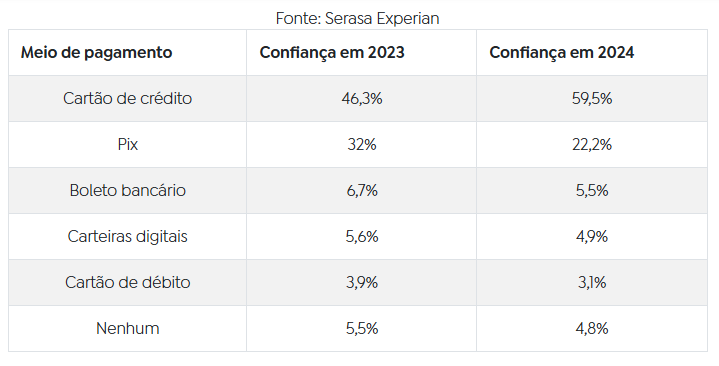 O estudo constatou que, apesar de ser o meio em que mais fraudes são cometidas, o cartão de crédito é o método de pagamento considerado mais seguro pelos entrevistados, superando a marca de 2023.
