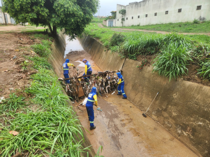 Nesta manhã, a Secretaria de Serviços Públicos está nas avenidas Integração, Sifredo Pedral, Crescêncio Silveira e nas ruas Genésio Porto e Paulino Santos, na praça Gerson Sales, e novamente no canal Santa Cecília fazendo a limpeza e desobstrução.