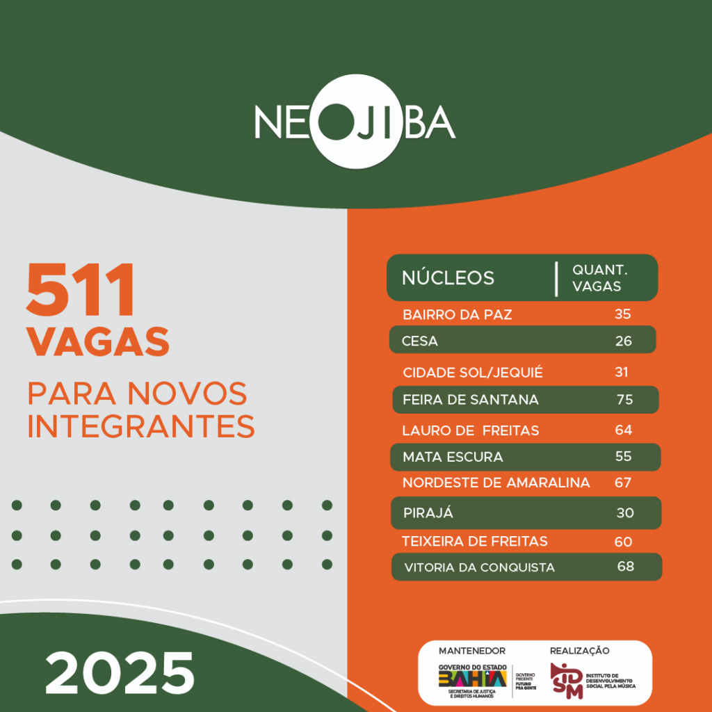 O NEOJIBA (Núcleos Estaduais de Orquestras Juvenis e Infantis da Bahia), que é referência no Brasil e no mundo em desenvolvimento social por meio da música, está com inscrições abertas para novos integrantes. São 511 vagas para crianças e adolescentes de 6 a 17 anos. As vagas estão distribuídas em 10 núcleos, localizados em Salvador e nas cidades de Feira de Santana, Jequié, Lauro de Freitas, Simões Filho, Vitória da Conquista e Teixeira de Freitas.