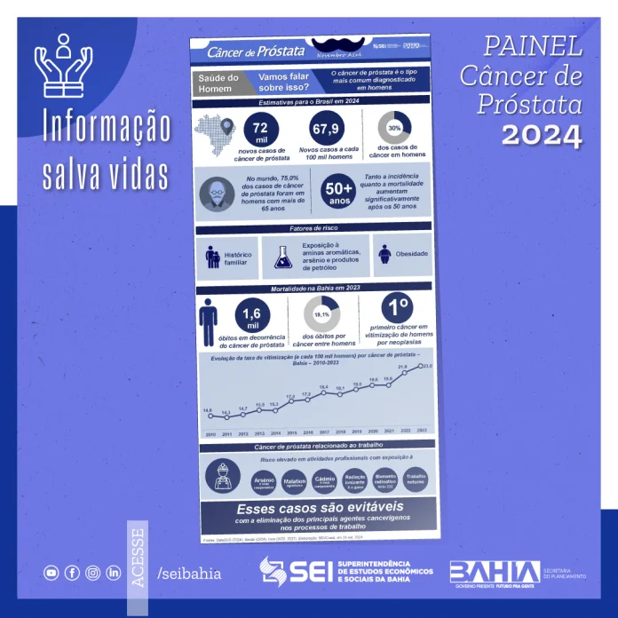 Outras informações podem ser conferidas no Painel do Câncer de Próstata, disponível no site da SEI (www.sei.ba.gov.br), na aba Saúde. Acesse aqui: https://sei.ba.gov.br/images/publicacoes/infograficos/cancer_de_prostata_bahia_2024.pdf