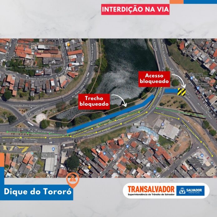O trânsito será interditado entre o final da Av. Vasco da Gama, no sentido Dique, e a rotatória da Praça João Mangabeira, nos Barris, na altura do viaduto Rômulo Almeida. A interdição do tráfego de veículos deve permanecer até 22h da próxima terça-feira (20). A obra é de responsabilidade da Embasa.