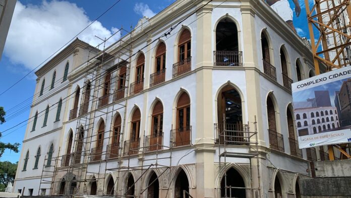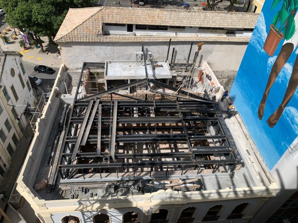 Já no casarão que abrigará a Sala de Espetáculos, as intervenções incluem a instalação da caixa dos elevadores e do reservatório inferior, além da restauração das paredes e do restauro interno das fachadas, já concluídas. Também foram finalizados os trabalhos nas paredes, laje subterrânea, pilares dos elevadores, vigas e escadas do quarto ao quinto pavimento da área de serviços.