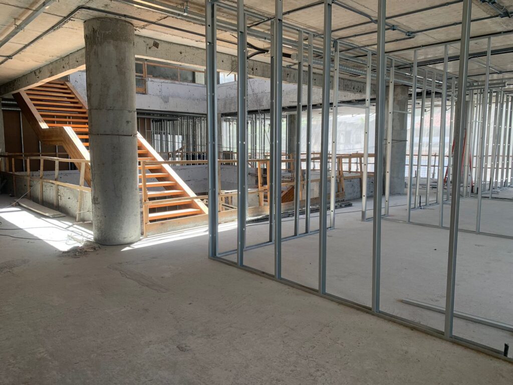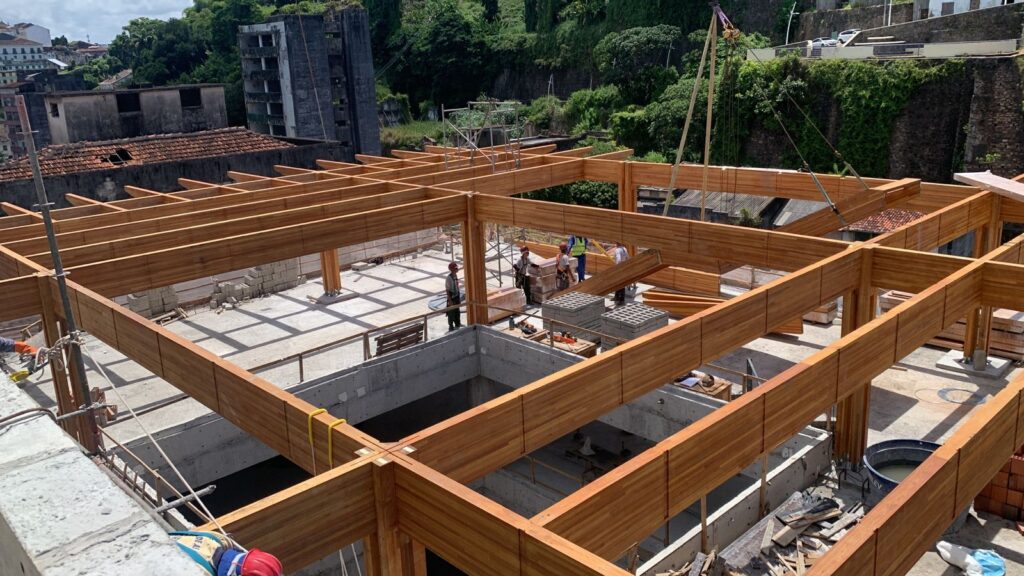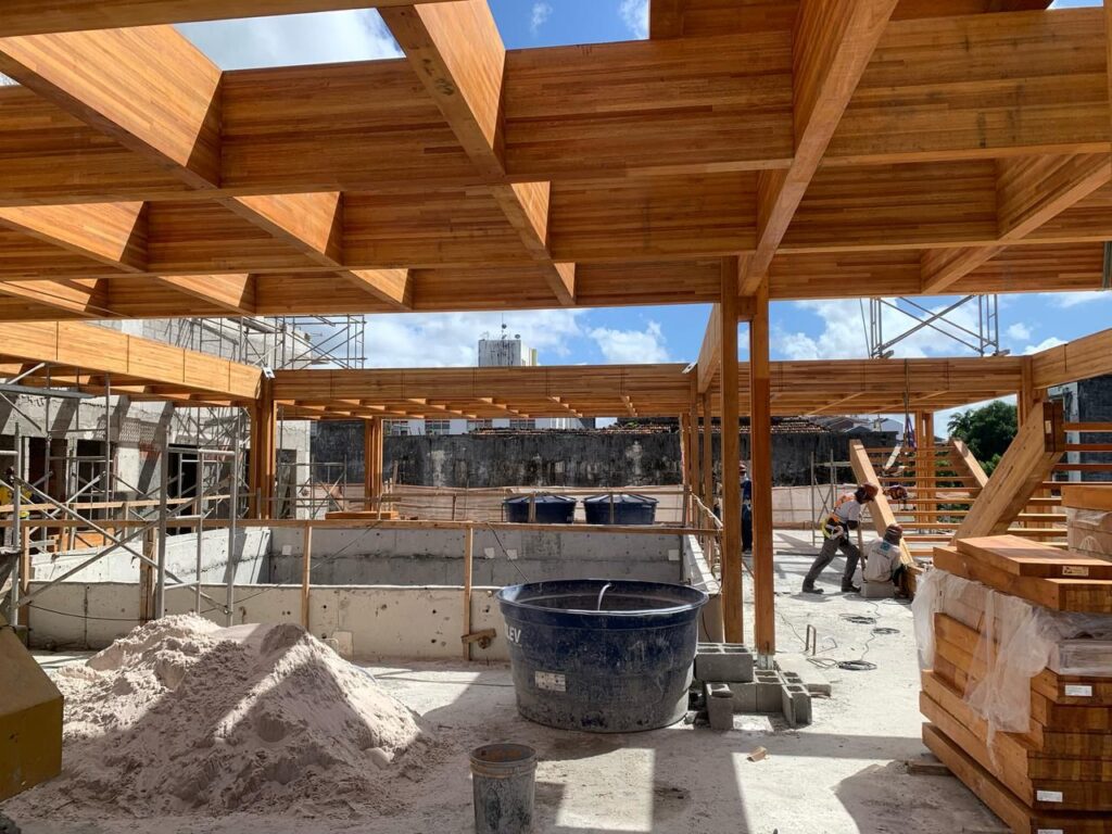 No momento, estão em andamento os serviços de alvenaria de vedação, revestimento de paredes e pisos em granito, além da instalação dos sistemas hidrossanitário, hidráulico, elétrico, eletrônico, de incêndio e climatização. As próximas fases incluem a instalação do isolamento acústico, montagem da cobertura de madeira com claraboia de vidro, escadaria em madeira e os acabamentos finais.