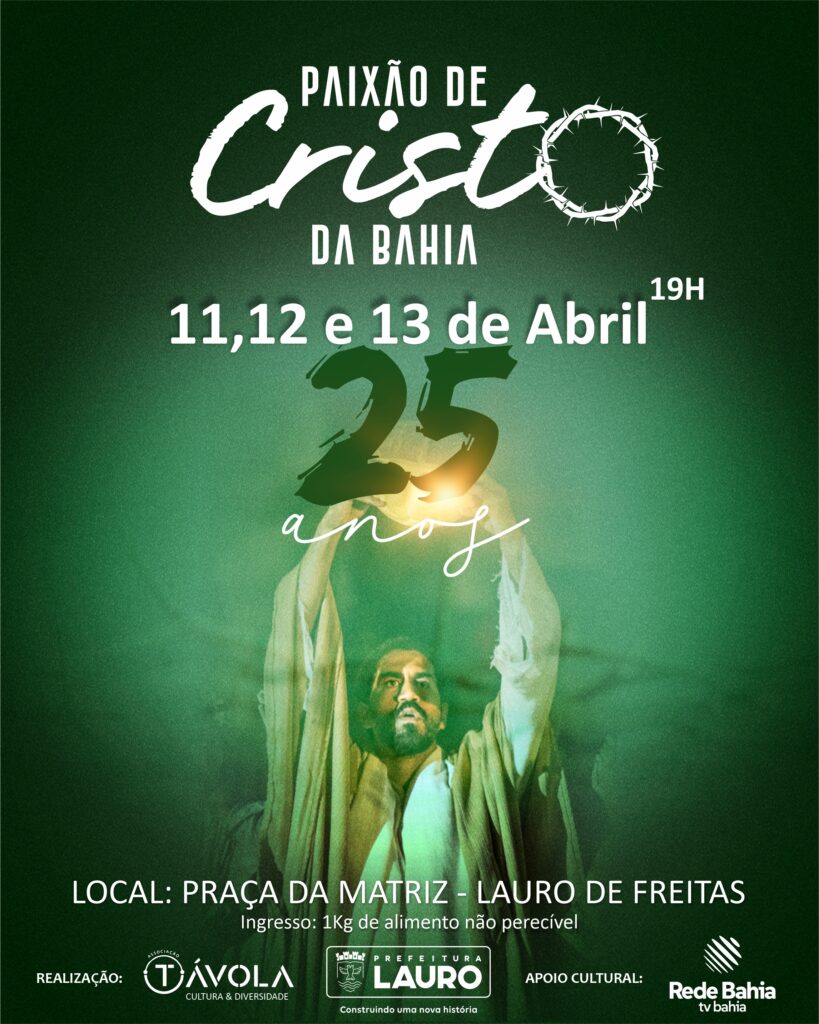 A cidade de Lauro de Freitas se prepara para receber a 25ª edição da Paixão de Cristo da Bahia, um dos eventos culturais e religiosos mais aguardados pelos munícipes. Nos dias 11, 12 e 13/4, a partir das 19h, a Praça da Matriz será transformada em um grandioso palco a céu aberto, reunindo mais de 200 artistas em uma encenação emocionante que retrata a crucificação e a ressurreição de Jesus Cristo. O evento promete um espetáculo que já é referência na cena cultural baiana.