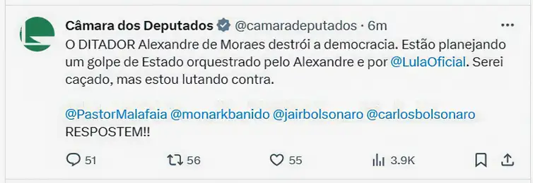 O perfil da Câmara dos Deputados no microblog X, antigo Twitter, foi invadido na manhã deste sábado (10) e trouxe às 11h09 uma publicação que chama o ministro Alexandre de Moraes, do Supremo Tribunal Federal (STF), de “ditador”. A postagem foi apagada logo em seguida.